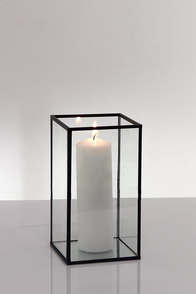 Fine black frame contemporary glass display boxes with mirror bases. Perfect for ambient candle arrangements, terrariums and more!